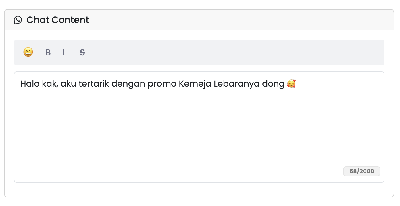 Selanjutnya, pada bagian / section Chat Content, kamu bisa isi Chat Content-nya sesuai dengan keinginan Kamu